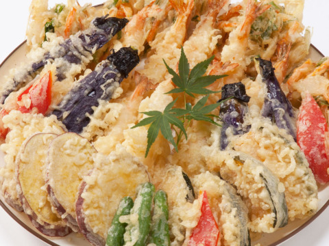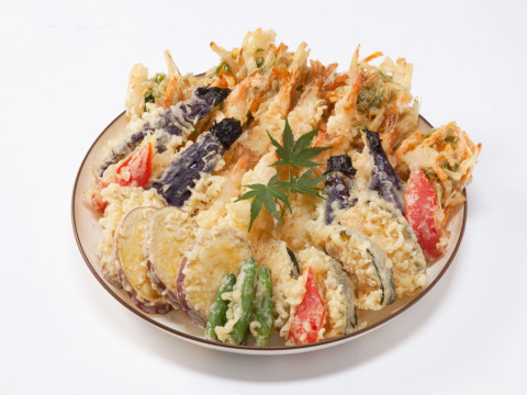 海老の天ぷらを中心に、数種類の野菜で彩り良く盛り付けます。
